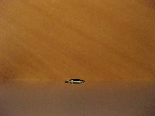 7. Primero ponga el interruptor momentáneo a través del agujero y compruebe si el botón sobresale lo suficiente (aproximadamente 0, 5mm es suficiente). Entonces sostenga en su lugar y poner pegamento caliente en el interruptor para que no se mueva otra vez.Una vez que el pegamento se secó, puede probar el interruptor presionando el plato en la mesa. Si encienden los LED el interruptor es agradable en su lugar. 8. una vez que el interruptor está en su lugar, puede pegar el resto del circuito en la placa inferior.