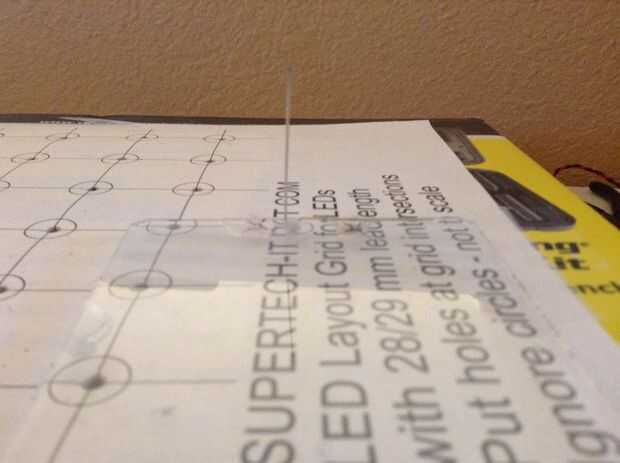 Utilice una broca del mismo tamaño como led, luego haga En el plástico. En la foto, suelo es el lado derecho del led, y Lado izquierdo del led es tensión. Asegúrese de que usted dobla tierra del led, Seguir repitiendo hasta que tenga 24 doblados.