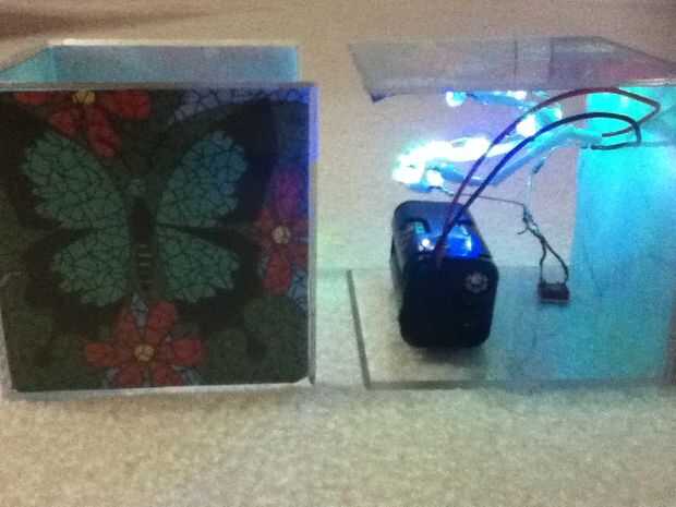 Esta creación entera todo comenzó con un esquema sencillo, y muy pronto, estaba partiendo de lo mano. He hecho esta nocturna mediante el uso de baterías, cables, un interruptor, LED, un marco de imagen de cubo y algunas fotos que imprimí de mariposas. Fue un proceso muy simple. Soldar la batería con el interruptor primero, y luego até el otro lado del conmutador a otro cable. Este fue el lado negativo de la energía. Entonces tomé el LED y soldar el lado negativo del LED a un conductor y el lado positivo a un cable separado. Después de esto, tomé el cable conectado al lado negativo de los LEDs y soldar con el alambre conectado al interruptor. Entonces, tomé el alambre conectado al lado positivo de los LED y había conectado al lado positivo de la batería. Entonces pongo este circuito en el marco de imagen en cubos, en la que me había pegado en cuadros de mariposas, que había impreso, pero solamente en 5 lados. La parte inferior del marco no tenía una imagen, como lo sería de todos modos. Y allí estaba! Un trabajo perfectamente luz nocturna!