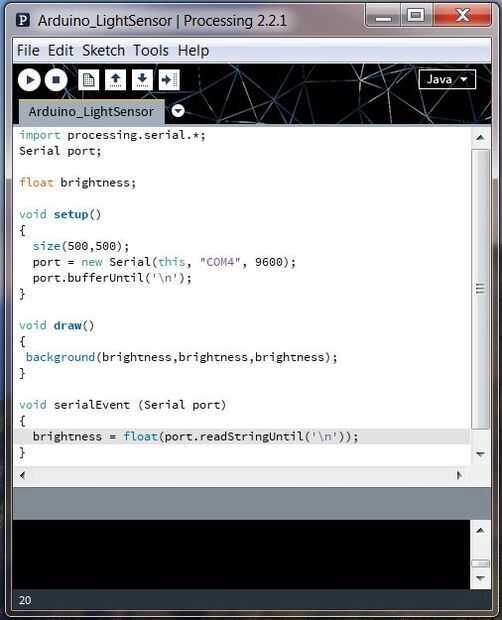 Este código es tomando el valor de 6 bits del puerto serie y usarlo como el valor RGB para el color de fondo de nuestro programa. Puesto que los tres valores RGB son iguales, lo verás desvanecerse de negro a gris a blanco.