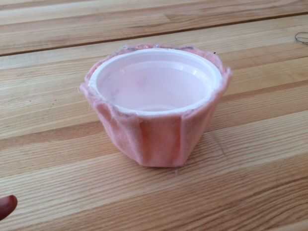 Cortar un círculo de fieltro lo suficientemente grande como para cubrir el exterior de su copa. Voltear el yogurt taza boca abajo y coloque el círculo de fieltro que se centrado en la parte inferior de la taza, arrugando un poco los bordes alrededor de la taza. Un limpiador de pipa alrededor del borde de la parte inferior de la bobina y lentamente la empujar hacia abajo (dobla el fieltro con él). Tapa la taza alrededor de nuevo y caliente del pegamento la parte superior del fieltro en el borde de la Copa.