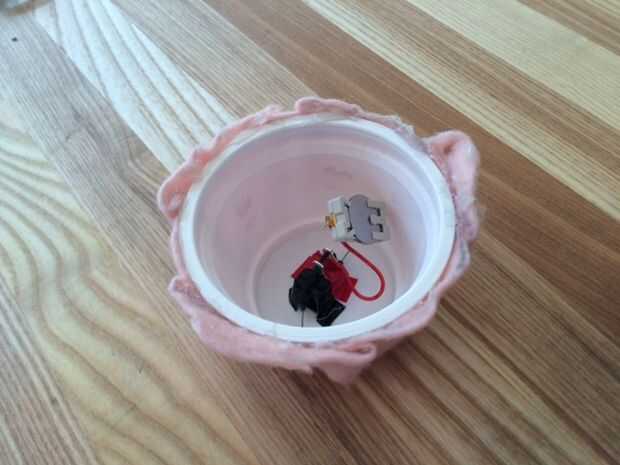 Pegue el interruptor a través del orificio en la parte inferior de la Copa (con una capa de fieltro que fuera de la Copa). Envuelva dos cables en el interruptor para comenzar el circuito. Conecte un cable al soporte de la batería y coloque la batería en el interior. El interruptor hacia abajo para asegurarlo con cinta pato.