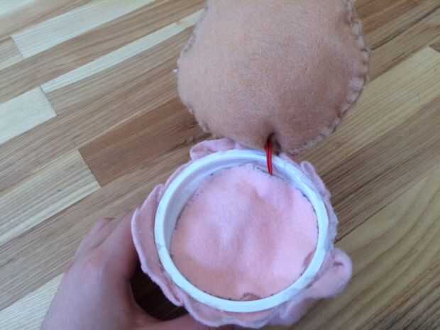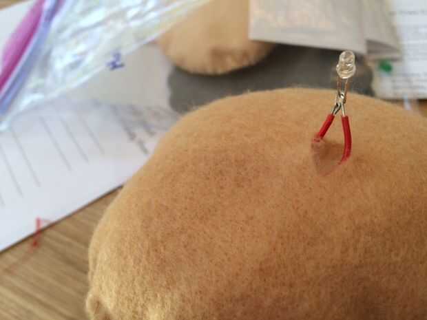 Cortar un círculo de fieltro del mismo tamaño que el borde de la Copa. Corte una pequeña ranura en el borde del círculo. Materia 3/4 de la Copa de yogur y cubrir el circuito con el círculo de fieltro, permitiendo que los alambres se deslice a través de la ranura. Empuje los cables a través de los orificios en la tapa de' muffin' y conecte un LED a los extremos (ahora es el momento para comprobar si su circuito obras/cualquier problemas con él).
