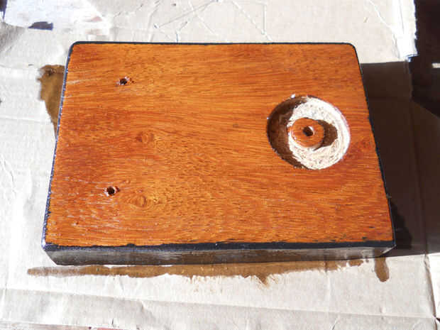 Pintado los bordes de la base de madera negra y manchada la superficie para adaptarse mejor a la pierna del trofeo de karate. La pintura que usé es una todo-clima-a base de aceite pintura negra, que tomó unos días para que seque correctamente.