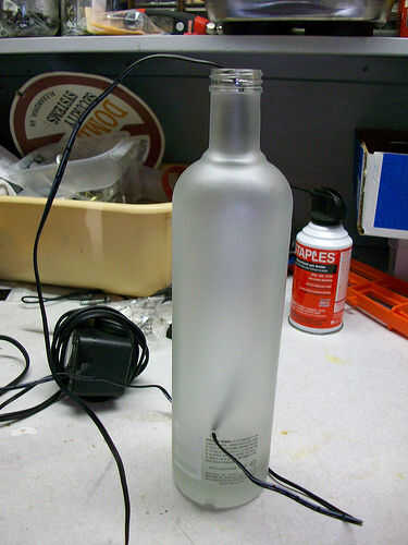 Aquí perfore un orificio en la parte posterior de su botella y entonces alimenta el adaptador de alimentación de alambre a través del agujero y fuera de la botella para que pueda trabajar en él.