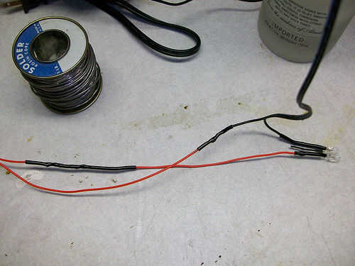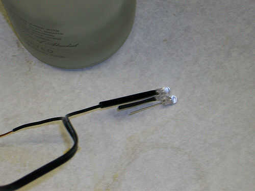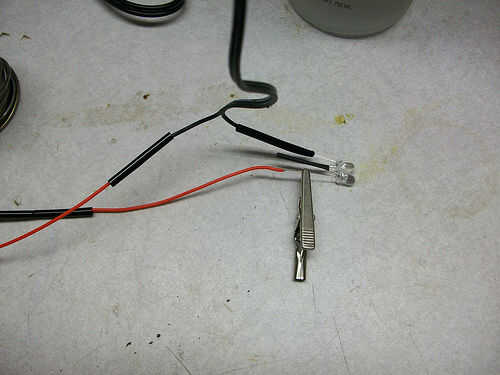 Aquí tienes que configurar el cableado para los LEDs. Conecte el positivo de un LED la negativa desde el segundo LED, les de la soldadura y aplicar shrink wrap. Entonces desde el adaptador de corriente, aplicar el cable positivo desde el adaptador de corriente al lado positivo del circuito del LED. Conecte el cable negativo desde el adaptador de corriente a uno de los cables el interruptor. Coloque el cable de otros desde el interruptor hacia el lado negativo del circuito del LED y ahora tiene una completa 2 LED interruptor de la luz. Prueba para asegurarse de que funciona entonces calor el shrink wrap hacia abajo para proteger y cubrir las conexiones soldadas.