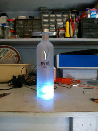 a pone los cables y LEDs dentro de la botella y el tornillo en la parte superior con los hilos originales de la botella y la tapa. Enchufe el adaptador de corriente y presione el botón de encendido sobre la botella y ver luz.