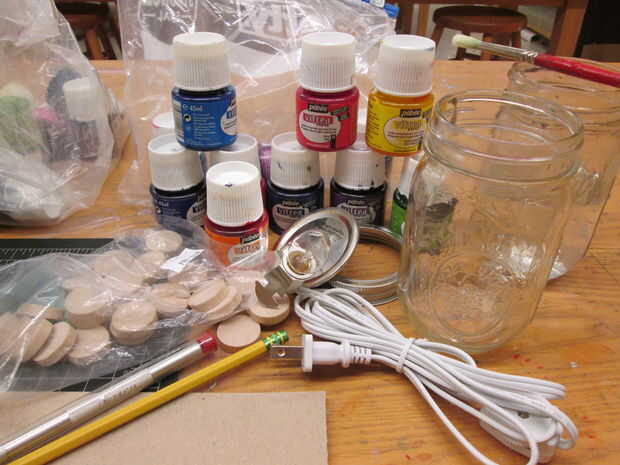 Pinta tamaño tarro de masón, cartulina, cuchillo del exacto, corte mat, lápiz, lámpara de noche (yo tengo la mía de artesanía nacional) pequeños discos de madera (realmente terminé con pequeñas espigas de madera, en la foto en el paso #3)