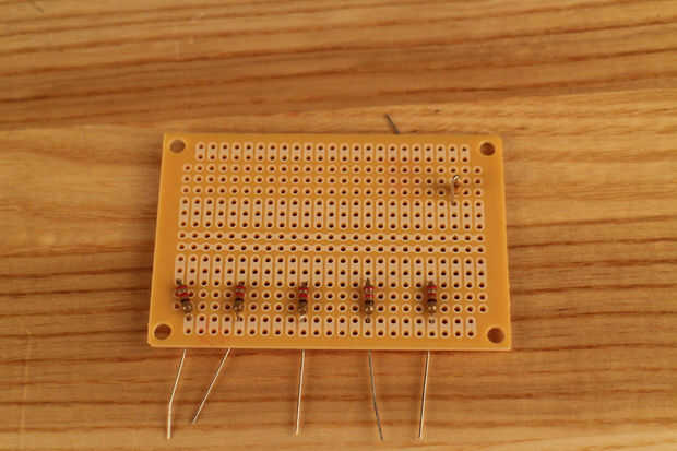 Lugar las cinco resistencias de 220 Ohmios espacian uniformemente a través del tablero. Antes de recorte, doblar las puntas de las resistencias que están hacia el borde del tablero para que todos los conecte y soldarlos en el lugar.