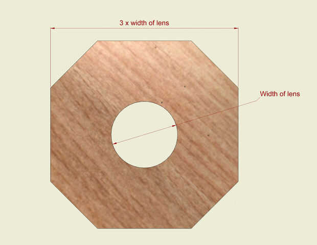El frente tenía la misma anchura y altura como 3 veces el diámetro de mi lente. También debe haber un agujero para el lente en el centro. Si se divide cada lado por 3, se puede recortar los extremos para formar un octágono.