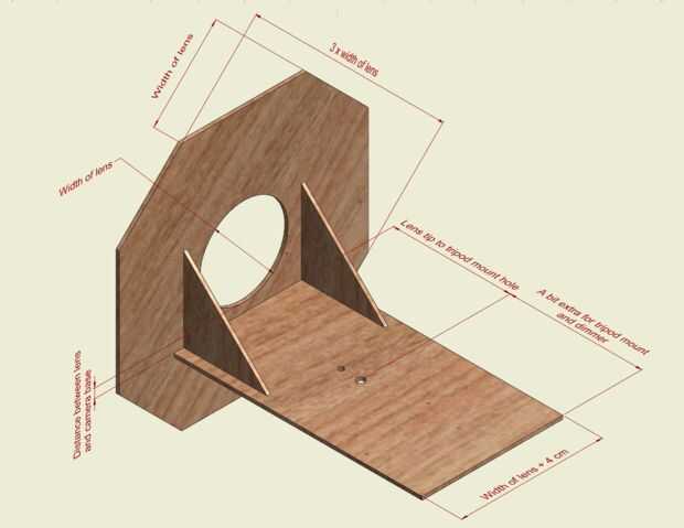 La base es un rectángulo con la misma anchura que la lente, más 2 cm a cada lado. La longitud es la distancia desde la punta de la lente del agujero de trípode, más un poco extra para trípode y el regulador; en mi caso, esta distancia adicional fue unos 10 cm.