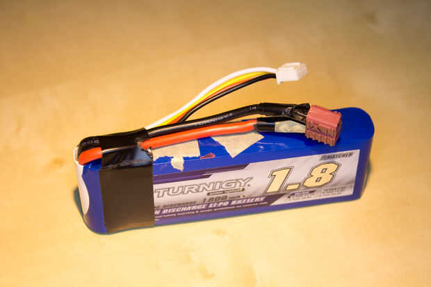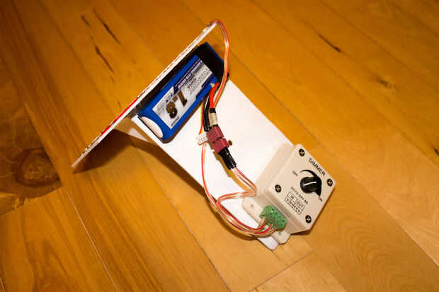Tuve una 11.1v batería de litio ahí. Cargada, estas baterías dan hacia fuera alrededor de 12.6, por lo que abofeteó a uno en la base con algún Velcro más, soldado cerca de 8 pulgadas de cable de conexión a un conector compatible, envuelve el conector en cinta eléctrica, había conectado al dimmer.