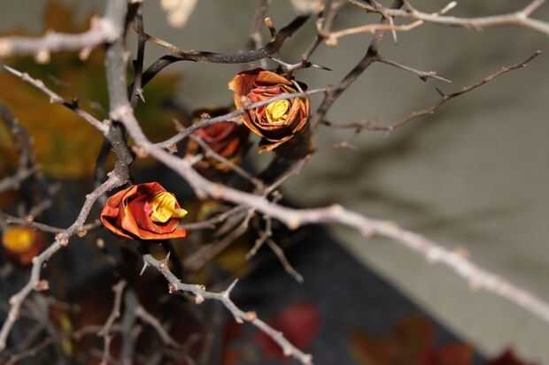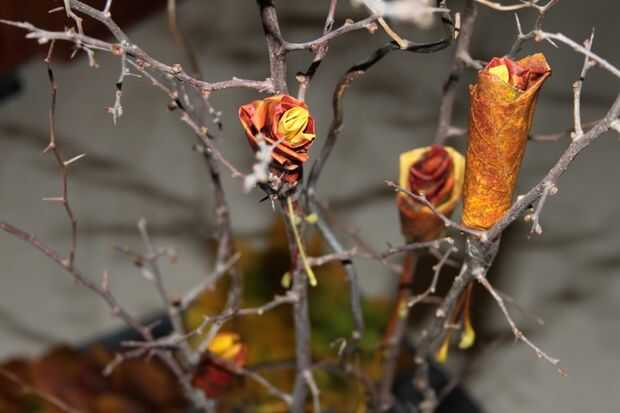 Arregló las ramitas en mi vaso y luego une las yemas y las flores en las ramitas con cinta de cello. Puede también con cinta adhesiva juntos y luego adjuntarlo a las ramitas. Consulte el paso 8