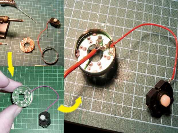 La primera soldadura era sujetar al clicker a los terminales negativos. El clicker encendido fue unido a un anillo que se llevó a cabo en el lugar cuando la linterna se atornilla juntos. Ya no tenemos la caja para fijar el anillo así que necesitamos ese anillo en el lugar a los terminales negativos de la soldadura.