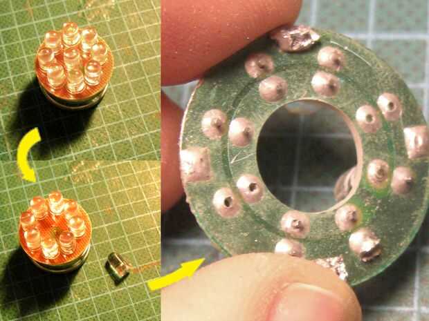 La matriz de LED que compré fue fabricada como un disco con el terminal positivo (+) en el interior y el negativo (-) terminal a lo largo de la parte exterior.
