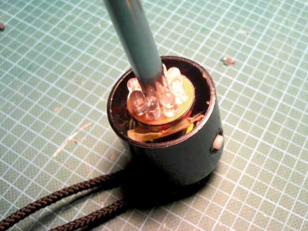 El árbol de paraguas de alimentación dentro de la abertura y luego vuelva a colocar la manija con algun pegamento. Puede dejar los LEDs sin pegar, así que son capaces de acceder y cambiar las baterías en un momento posterior sin dañar el conjunto.