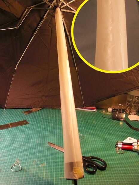 (Te recomiendo practicar primero en material de desecho, es muy fácil de fundir a través de la media. Un tema que es difícil de reparar y puede comprometer la genialidad de su paraguas.)