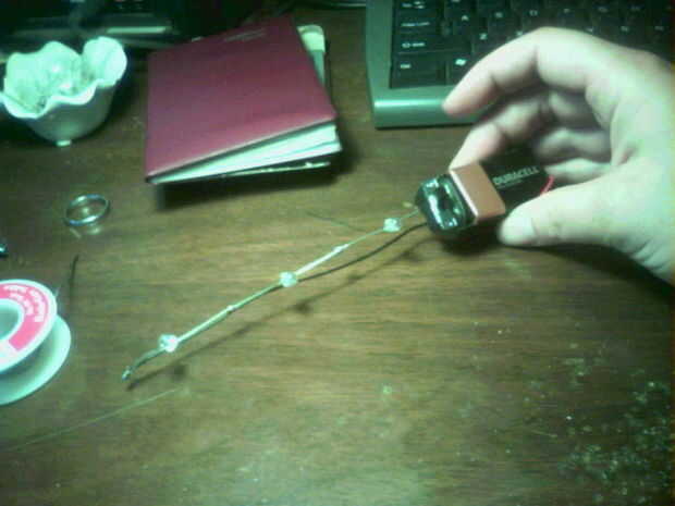 Seguir adelante y soldar el otro extremo de la serie LED en la punta del cable negro (usted puede mantener la batería conectada, no se preocupe). Has 'completado el circuito' y se han hecho una luz poco ingeniosa que usted puede encender y apagar.