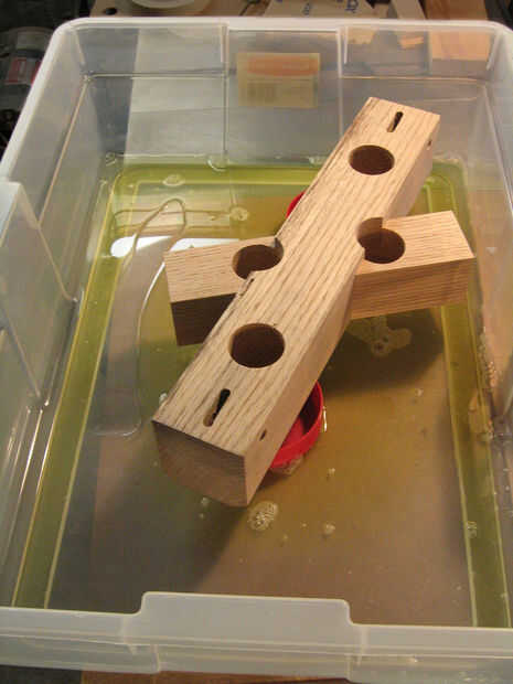 Puesto que la madera no debe entrar en contacto con el líquido limpiador, coloque el trabajo en el recipiente en algún tipo de soporte. Tenga en cuenta que las áreas que hacen con con el soporte no se mancharon uniformemente.