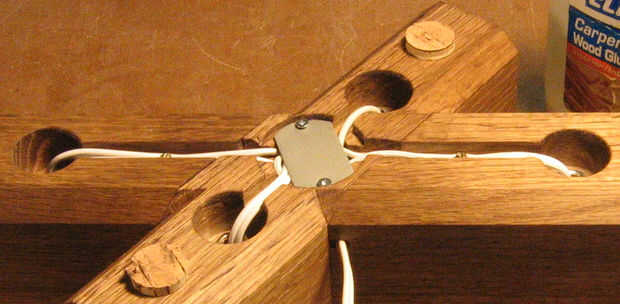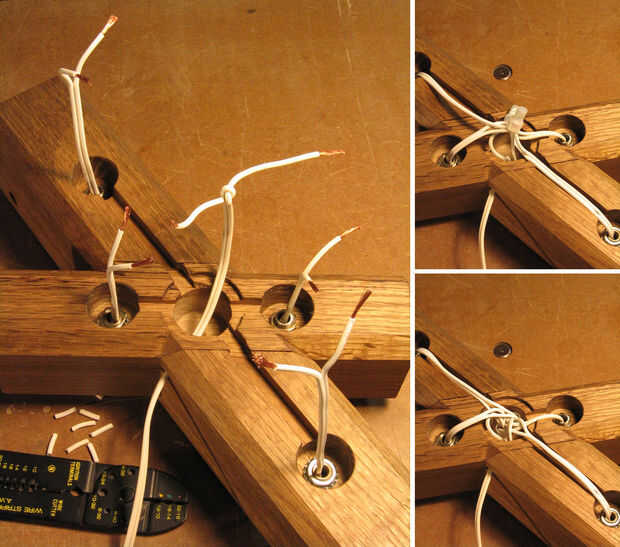Ejecute uno de los extremos a través del orificio de salida de alambre en la madera base, dividir los conductores para una longitud de aproximadamente dos pulgadas y un nudo con uno de los conductores. La quinta foto muestra cómo su proyecto debe cuidar de esta tarea.