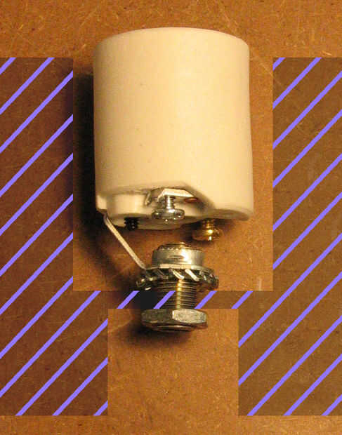 Ahora se instalan los zócalos de cerámica el primer funcionamiento del cable de la lámpara a través de la varilla roscada y fijación de las tomas a los soportes en la base de madera.