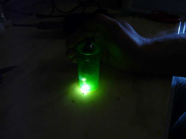 Ahora puede fijar la cadena, cadena o lo que sea a la botella con una goma o zip empate. Te recomiendo que uses la amarra, lo veremos mejor. Cuando la pruebo en mi apartamento, todavía la veo en una distancia de aproximadamente 10 pies.