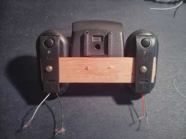 Para colocar las luces de dos laterales agregué unas cuantas pulgadas de un viejo palillo de pintura, unos tornillos, grapas y una cantidad generosa de pegamento caliente.