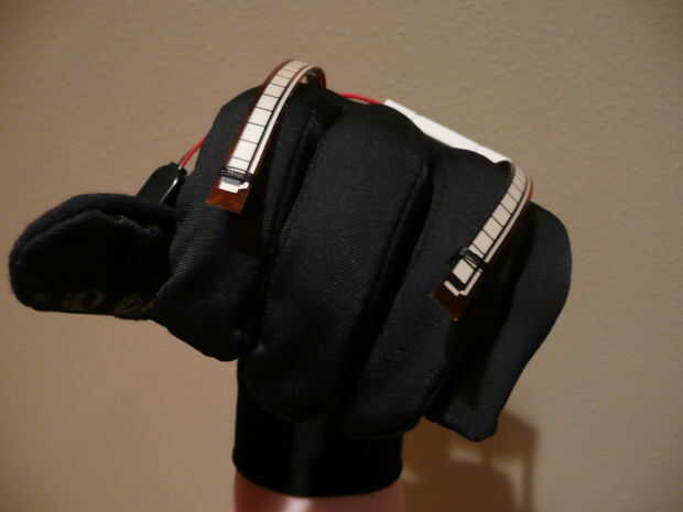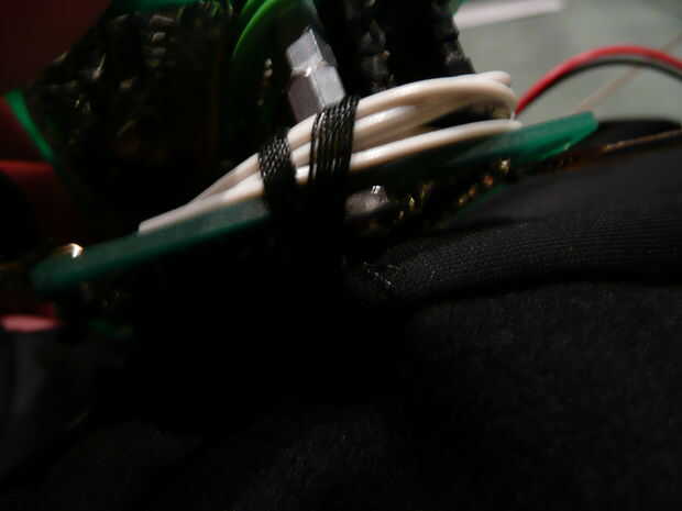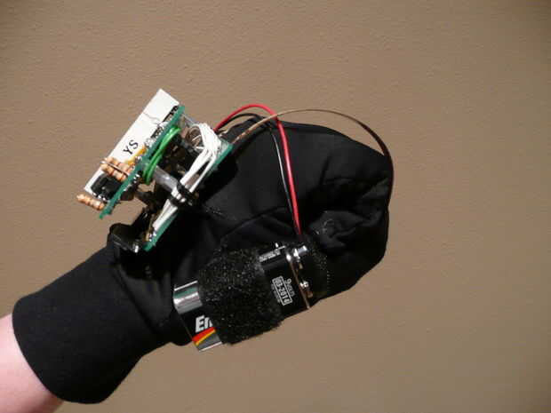 Fui a mi tienda de bicicletas local y obtuvo el guante de dedo completo más barato que pude encontrar. Dedo completo es necesaria porque de lo contrario no se puede conectar los sensores de flexión muy bien. Luego pasó por una tienda de tela y tiene un hilo de poliéster y velcro adhesivo. Puse el guante y colocar el circuito en mi mano. Parte del posicionamiento es la comodidad pero otra parte es los sensores de flexión. Debe ir por el medio de dos dedos. He cosido lazos alrededor de los tres separadores para aferrarse a la placa principal (ver cuadro #2) y luego sueltas bucles 3/4 de la manera abajo de cada dedo de sensor flex (#3 y 4). Asegúrese de que no coser su guante cerrado. A continuación pegué un trozo de velcro en la parte de mi pulgar para sujetar la batería. He encontrado después de probar que realmente paga coser esto también como el palo no dura demasiado tiempo. A continuación pongo un bucle de velcro alrededor de los 9v (cuadro 5). Esta configuración parece que funciona bastante bien. Como ves en las fotos de las diapositivas de la primeras y la últimas, ahora he añadido mangas para los sensores de flexión pero si no tienes el tiempo, bucles de deben hacer bien.