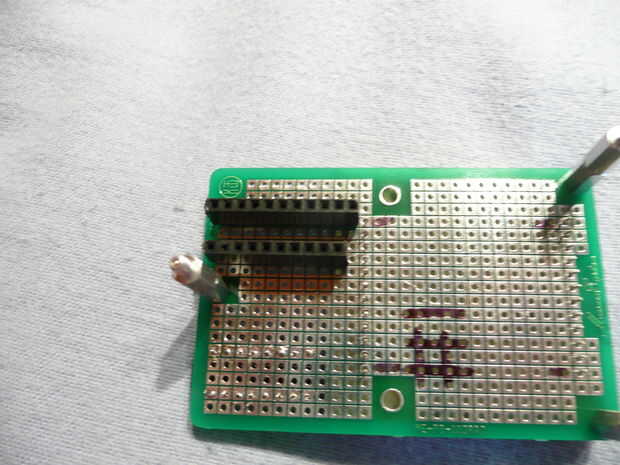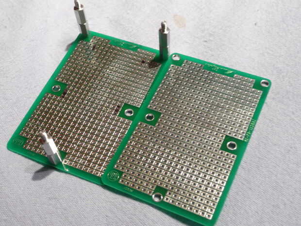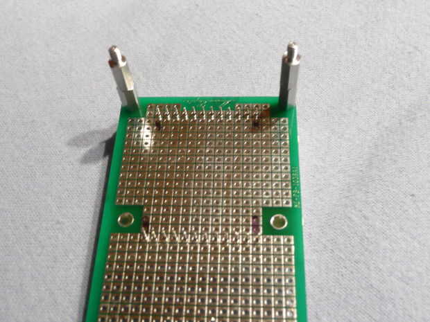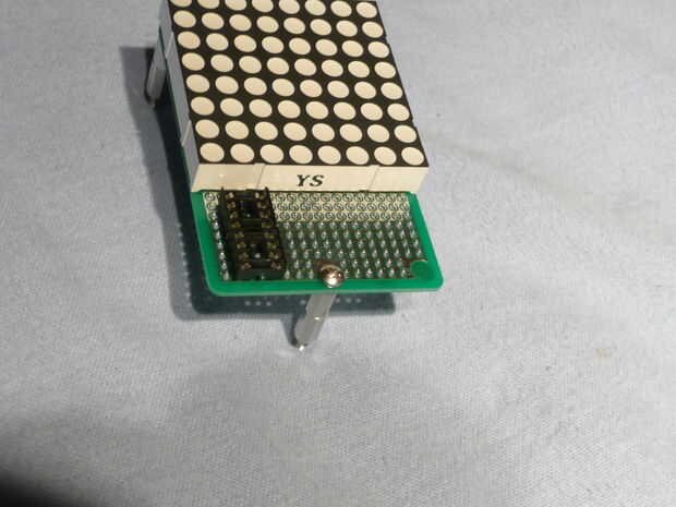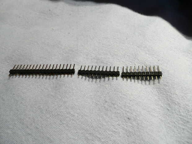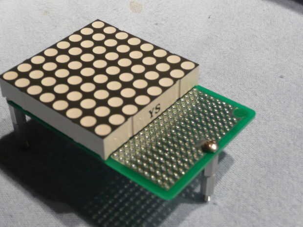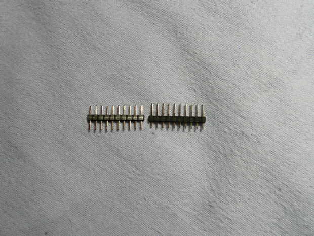 First, add the standoffs.  Tienes a dos para obtener la altura adecuada.  Asegúrese de que los separadores son descendentes desde el lado con los cojines cuadrados.  De esta forma puede puente cojines con la soldadura en la parte inferior y puente con el botón común en la parte superior para conectar a tierra.  A continuación agregar la matriz de LED y en la soldadura.  Debe ser medida hasta el borde del tablero con el los dos stanoffs que se puede con el YS hacia el lado opuesto.  El pin en la parte inferior izquierda es el pin 1. (También está marcado en la imagen.)  A continuación añadimos las tomas dos 8 pines uno encima de otro para formar uno de 16 pines.  Asegúrese de tener un espacio a la izquierda y luego de en la soldadura.  A continuación divide las cabeceras masculinas y femeninas en secciones de pin 10 y 11.  Usted necesitará dos veces tantos encabezados femeninos.  La soldadura de los de como se ve en la foto.  En cuanto a las cabeceras masculinas que necesita cambiar el pin por lo que es una cantidad igual a cada lado del plástico es más fácil mirar un cuadro para ver lo que me refiero así que echa un vistazo a #6.  He utilizado unos alicates y funcionó bastante bien.  Ahora si usted toma las cabeceras hombres y colocarlos entre los headers hembra 2, verá que ahora son del tamaño adecuado para conectar el tablero superior e inferior juntos.