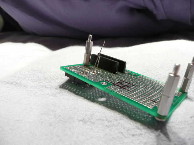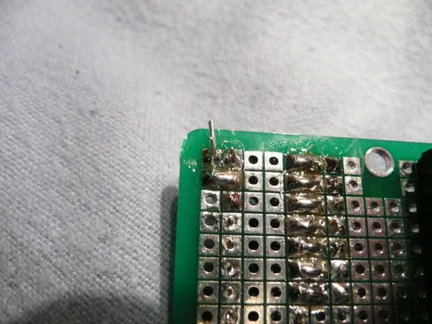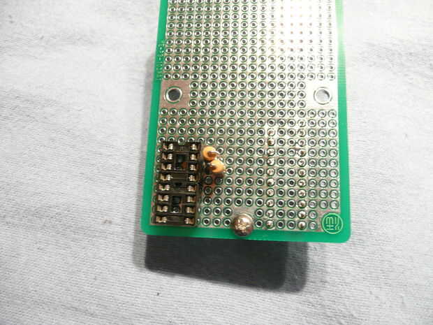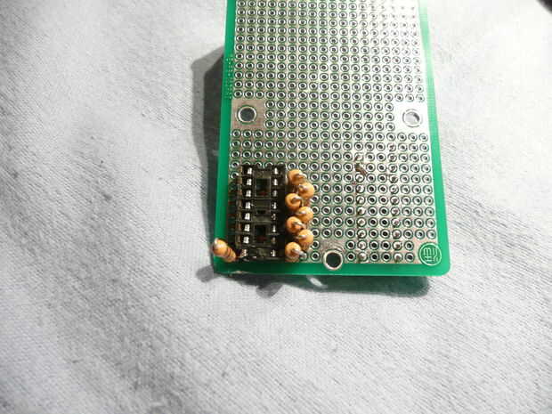 Estas resistencias van entre los LEDs y el 74138 (tierra) para proteger el conjunto. Doblar uno de los cables de la resistencia sobre la parte superior para que los dos conductores son paralelos. Que encajen en el pines 7, 9, 10, 11, 12, 13, 14 y 15 y la soldadura. He encontrado que funciona mejor si se alterna la dirección de la resistencia como se puede ver en las fotos segunda y terceros.