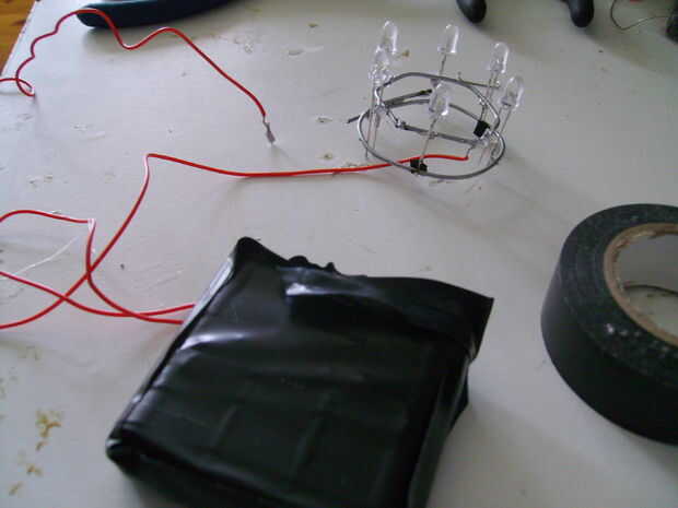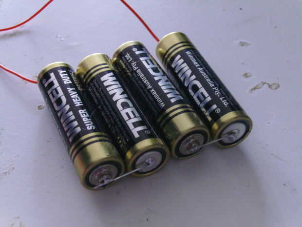 Entonces una batería AA y el otro extremo de su cable a su extremo negativo de la soldadura. Haz una pequeña longitud de cable (10-15mm) y la soldadura de un extremo a lo positivo de esta batería y el otro extremo al negativo de otro. Continuar así hasta las cuatro pilas están conectadas en serie.