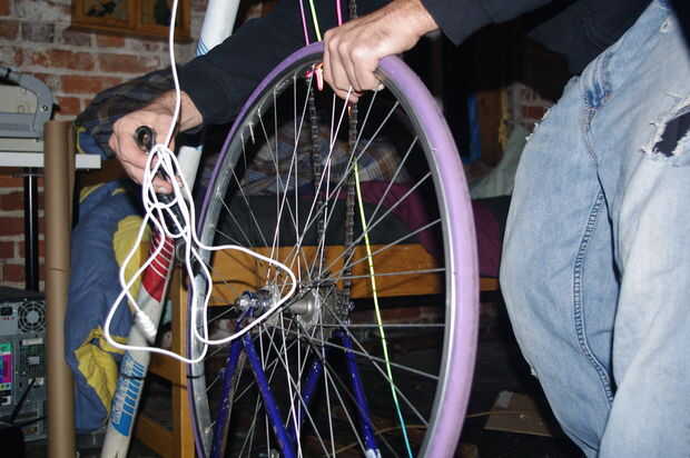 Se utilizó una rueda de bicicleta trasera carretera de 700 c. Usted podría utilizar un 26 o 24" rueda de la bici de la montaña. Ruedas más pequeñas también podrían funcionar, pero nosotros no hemos probado. Debe ser una rueda trasera con cintas y rueda libre. Una fixie no funciona del mismo modo, como que no mantenga la inercia inducida por inercia hacia delante de un usuario de swing. Esto significa que, cuando el usuario swing llega a un punto máximo, la cadena se tira en una dirección. En el otro punto se tiró la otra dirección. Con una rueda regular, la dirección de no participar no tiene un efecto sobre la rueda. En una fixie, hace la rueda al girar la dirección en este momento.