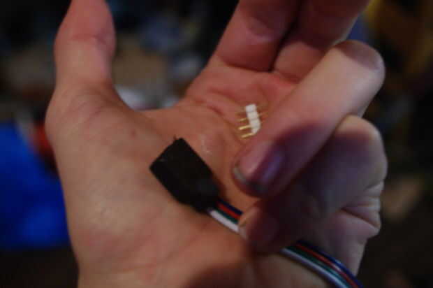 Esto debe suceder con su rectificador + condensador y su batería. Si usted decide hacer el circuito completo, simplemente el interruptor entre pruebas y ruede la rueda con las manos (¡ o usted puede utilizar el columpio si eres lo bastante afortunado como ser capaces en este momento y mucho cuidado!). Asegúrese de que funcionan como usted espera. En la foto es un conector de 4 pines es necesario conectar los LEDs en su caja de control. el kit de LED debe venir con esto. Tenga en cuenta que necesitará esto para la encaminamiento de cable!