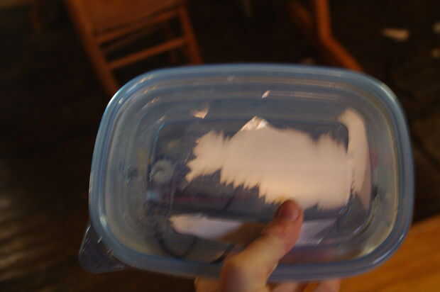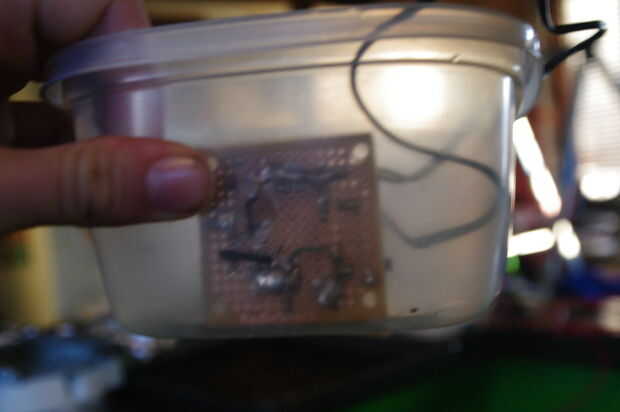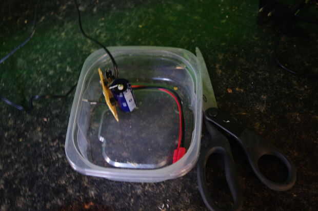 Hice un contenedor de circuito de una vieja caja de tupperware con tapa (algo más robusto sería mejor, aunque!) Esto no es totalmente impermeable, pero es protectora. (Nota: Asegúrese de que tupperware es seco!). He colocado el circuito y entonces corte los orificios con cuchillas y tijeras para los 2 cables AC y otro para la potencia de los LEDs. el cuadro era lo suficientemente grande como para albergar la batería de LiOn, así.