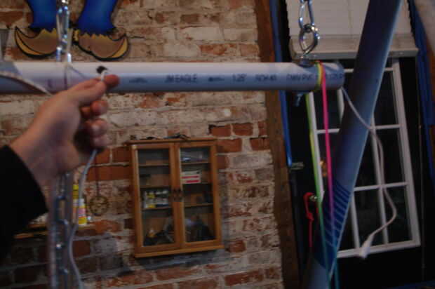 De la caja de control LED, perforó un agujero en el brazo del oscilación y enruta el enchufe de la extensión del CC de la caja del circuito sobre la tierra, a través de un conector de tubería de PVC de 4 vías y un brazo de 1 pie que sobresale de la base debajo de la rueda. Esto permitió que el cable de extensión caer donde no interfieran con la rueda.