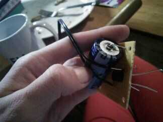 La soldadura de las patas del condensador rectificador y salida una vez que haya verificado que estén correctamente orientadas como se describe anteriormente).