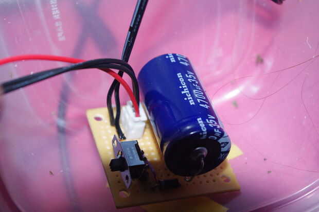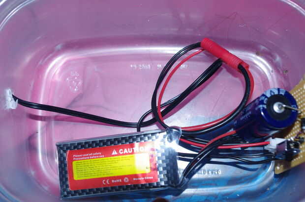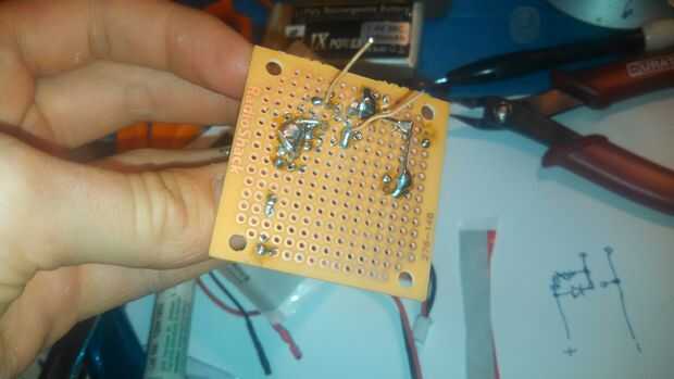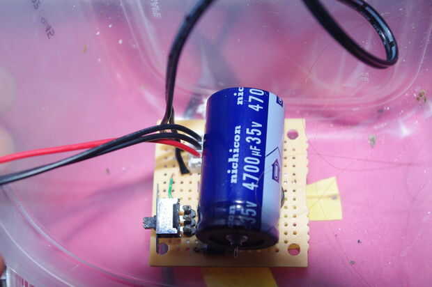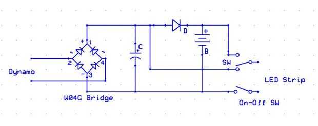 Hemos añadido un interruptor, 2 puentes (pedazos pequeños de alambre aislado), los pernos para la conexión de la batería, una tensión inversa de 100V y 1.2V adelante voltaje en 2A FR202 diodo para evitar la carga que fluye hacia y dañen el circuito y el dynamo y permitir carga cuando la batería no está en uso y un 11.1V (11.1-12.6, cargada) batería de LiPo de un proveedor de RC de la manía. El diodo es un cambio de un circuito en el primer paso.