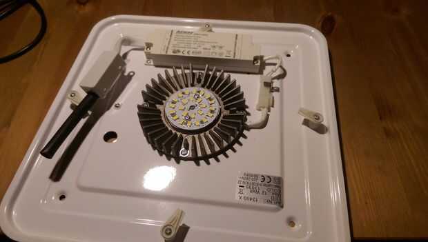 Este proyecto comienza con una lámpara de techo regular a modificar. Tiene que ser una lámpara con LED con una unidad de LED interior y módulo de alimentación voltios 12. Esta configuración le permite conectar su propia electrónica entre la alimentación y la unidad de LED. Por supuesto, el aparato necesita tener suficiente espacio físico repuesto para nuestros componentes electrónicos así - cerca de 8.0 x 5.0 x 3.0 cm (o 3.1 x 2.0 x 1,2 pulgadas).