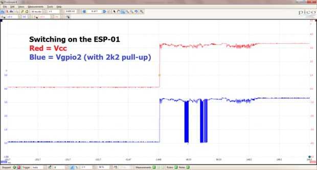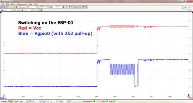 El ESP-01 es barato, pequeño y tiene un conector fácil de usar 2,54 mm/0,1 '' pitch. La desventaja es que sólo tienes 2 pins de (GPIO) de entrada/salida de propósito general: GPIO0 y GPIO2. También, tanto de estas necesidad se tiró alto inicialmente para microcontrolador adecuada puesta en marcha y que son conducidos por el gestor de arranque para un cortocircuito mientras que después de la puesta en marcha (como puede verse en las dos imágenes de alcance adjunto). Estas cosas llevará a parpadeo sensible si nos conduciría la lámpara directamente desde cualquiera de los pines.