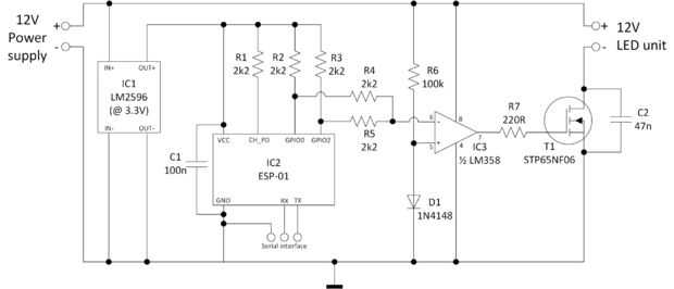 Las salidas de GPIO0 y GPIO2 se alimentan en la entrada inversora del opamp a través de R4 y R5. La entrada de no inversión de lo opamp obtiene una tensión de referencia de acerca de 0.5V creado por R6/D1. Esto configura la función ni deseada. Alimentando el opamp con 12V, también proporciona el impulso necesario de los 3.3V lógica de la ESP-01 a la 10V + necesaria para coche totalmente el MOSFET. Conducimos el MOSFET de la salida del opamp a través de R7. Mientras que esto ciertamente no tiene un controlador MOSFET ideal, es absolutamente buena () lo suficientemente rápido como para esta aplicación. Al construir el circuito en un protoboard notó algunos picos de voltaje y timbre, probablemente relacionado con la auta inductancia de los cables entre la unidad de LED y el MOSFET. Yo (crudamente pero eficaz) había suprimido este poniendo C2 sobre fuente y dren.