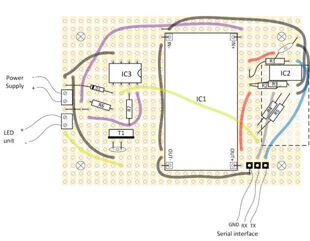 Para conectar la PCB, usé terminales para la fuente de alimentación y las conexiones de unidad de LED y un encabezado de impresión masculino para exponer el puerto serial de la ESP-01. El último no es necesaria, pero recomienda hacer depuración si es necesario.