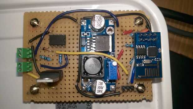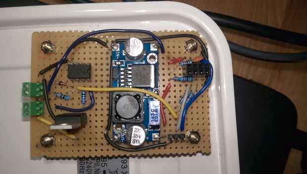 Todo en un pedazo de prototipo PCB board acumulado. Utilicé el tipo que tiene tiras de cobre que conecta 3 agujeros como una cuestión de preferencia personal. Iniciado por 4 taladros en las esquinas para poder montar la Junta más adelante, luego soldar los principales componentes activos y la toma para el ESP-01, entonces todo lo demás.