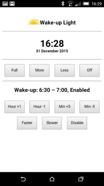Ahora puede configurar el período de despertar y activarla. Cuando quiere ir a dormir, no interruptor apagado las paredes como el conjunto perderá energía por supuesto. Por el contrario, pulse el botón 'off' en la aplicación. Usted va ser suavemente despertada en el tiempo configurado a la mañana siguiente.