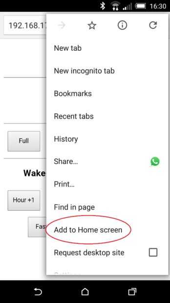 Al encender la lámpara con el interruptor de pared, la luz debe ir completamente en como de costumbre, pero con un retardo corto (mucho menos de un segundo, pero sensible). Ahora debe ser capaz de apuntar el navegador del móvil a la dirección IP de la lámpara y visite la página web. Con la opción 'Añadir a pantalla de inicio', puede Agregar un icono a la pantalla principal para iniciar esto como una verdadera aplicación (esta probado en Android pero también debería funcionar en iOS).