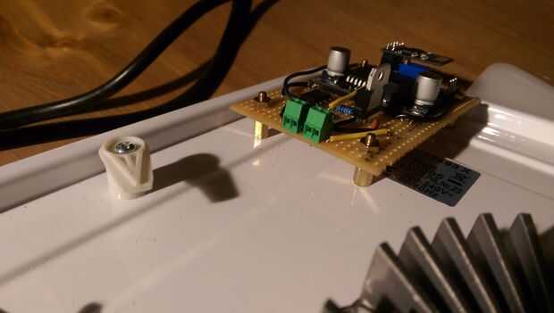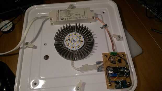 Para montar la placa en el aparato, por supuesto necesitará perforar algunos agujeros en ella. Quité la alimentación y la unidad LED antes de hacerlo, para evitar las vibraciones perforación dañarlos. Después de que el PCB puede montarse usando a los espaciadores. Retirar los alambres de conexión originales de la fuente de alimentación y utilizado para conectarse a la placa en su lugar. Utilicé un trozo de alambre doble para conectar la placa a la fuente de alimentación. Después de esto, la lámpara podría ser montada en el techo!