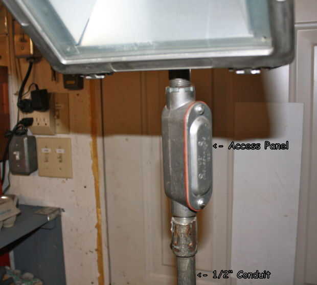 Ahora toma el tubo de rosca gas de 1/2", otra vez la longitud es su opción. Pedazo de hilo en el recto a través del conector en la parte superior de la tubería y por encima de ese hilo en el 2". En la parte superior 2" pieza, hilo en la caja de empalme de 1/2". En la parte superior de la caja de empalmes, hilo de rosca en el centro de atención. Abra la tapa del panel de acceso y ejecutar el alambre desde el centro de atención a la caja de empalmes. Tome la extensión y correr hasta la tubería de 3/4" a través de la ranura de corte en él. Pase el cable por el tubo de 3/4' y 1/2" tubo de gas hasta la caja. Conecte el cable de extensión para los cables desde el centro de atención. Una vez hecho esto, cierre la cubierta y listo.