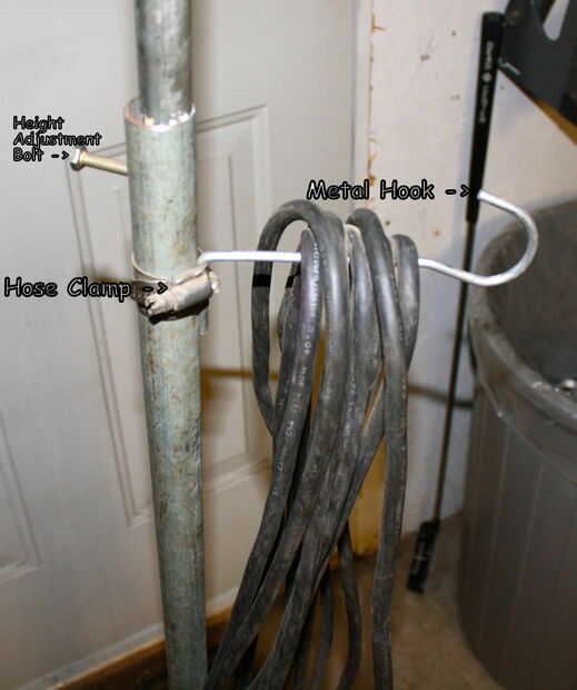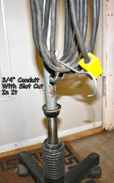 Empieza por tomar la longitud de tubería de 3/4", (la longitud es su elección). Perfore un par de agujeros de unos 4" arriba de la parte inferior. Taladre los orificios unos 3" aparte. Una vez que los agujeros de perforado, corte el metal entre los orificios para formar una ranura. Esto es donde se ejecutará la extensión hasta la luz. Aproximadamente una pulgada desde la parte superior, un taladro y aprovechar algún hilo. En este hilo del agujero de un tornillo. Esto le permitirá ajustar la altura del centro de atención. Ahora puede instalar los ganchos para sujetar el cable. Tuve un par de ganchos de aluminio que doblado y atado con el par de abrazaderas de manguera. En hacia arriba y uno hacia la parte inferior de la tubería de 3/4". Para el que hice, la tubería de 3/4" Acomódesela encima del poste base de silla.