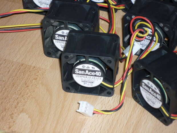 d.) par de ventiladores para la refrigeración activa. Tomé un par de 12V rescatado 40 x 40 mm x 28 mm los aficionados del servidor, que 0,15 amperios cada a 5V. Y puesto que los ventiladores están funcionando a menos de la mitad de su diseño de tensión de 12V, son apenas audibles cuando alimentado desde una fuente de 5V.