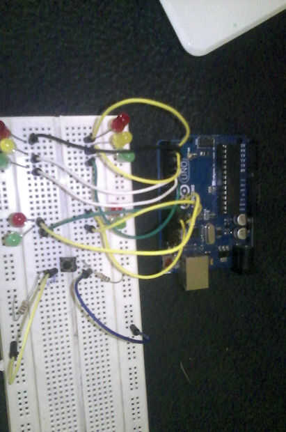 Tomar LED parte número de pin ARDUINO LED rojo 10, LED amarillo ARDUINO pin número 9, número de pin ARDUINO 8 LED verde y pequeño LED rojo número de pin ARDUINO 13, pequeño LED verde a ARDUINO pin número 12 como se muestra imagen.