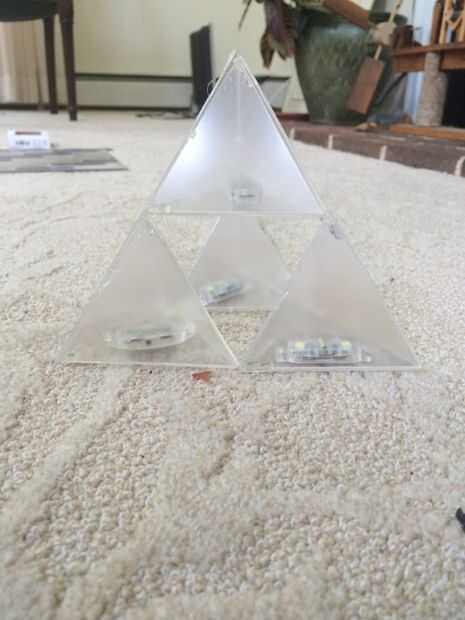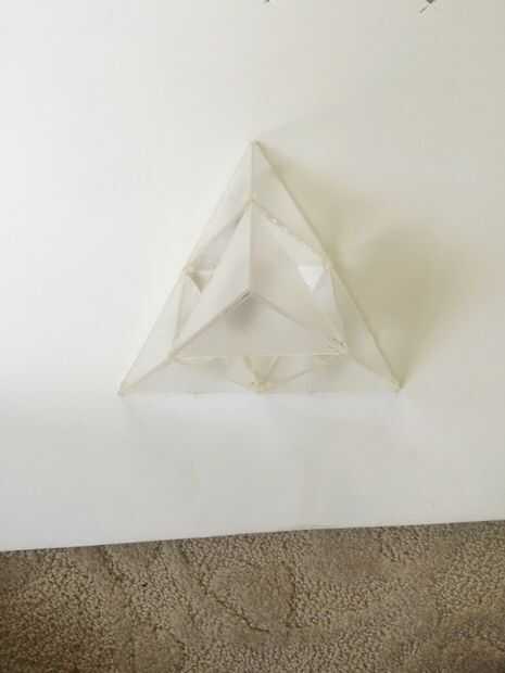 Cómo montar: caliente pegamento entre las esquinas exteriores de los triángulos. Hacer el triángulo tres base primero. Luego pegar sobre la pieza final superior.